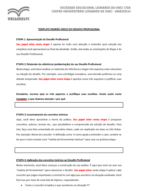 Outro ponto importante é que a Uniasselvi utiliza um template padrão único para o Desafio Profissional. Isso significa que a estrutura do arquivo é a mesma para diferentes áreas, cursos e disciplinas, enquanto o que muda é o tema solicitado no enunciado. No template, o estudante precisa desenvolver etapas como a escolha de aspectos relevantes do caso, o levantamento de conceitos teóricos, a aplicação da teoria à situação proposta e a redação final do memorial. Por isso, é uma atividade que exige interpretação, organização e escrita coerente dentro do modelo solicitado pela instituição.