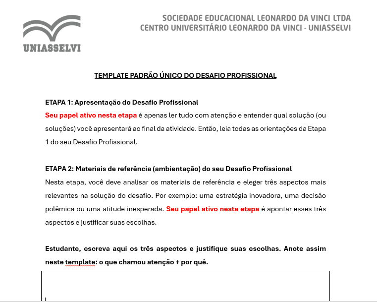 Esta é a descrição do seu Desafio Profissional. Para que você possa desenvolver sua atividade e chegar à conclusão desta avaliação, é preciso baixar e salvar o Template Padrão Único em Word que está disponível no link ao final desta descrição. Para baixá-lo, clique em Arquivo > Criar uma cópia > Baixar uma cópia. Você só conseguirá editar o template depois de salvá-lo.