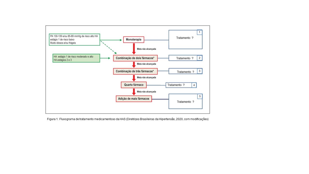 Conforme as Diretrizes Brasileiras de Hipertensão Arterial (2020), a hipertensão arterial (HA) uma doença crônica não transmissível (DCNT) definida por níveis pressóricos, em que os benefícios do tratamento (não medicamentoso e/ou medicamentoso) superam os riscos. Trata-se de uma condição multifatorial, que depende de fatores genéticos/epigenéticos, ambientais e sociais, caracterizada por elevação persistente da pressão arterial (PA), ou seja, PA sistólica (PAS) maior ou igual a 140 mmHg e/ou PA diastólica (PAD) maior ou igual a 90 mmHg. Os dados de prevalência no país tendem a variar conforme a metodologia e as casuísticas utilizadas. Segundo a Pesquisa Nacional de Saúde de 2013, 21,4% dos adultos brasileiros autorrelataram HA, enquanto, considerando as medidas de PA aferidas e uso de medicação anti-hipertensiva, o percentual de adultos com PA maior ou igual que 140 por 90 mmHg chegou a 32,3%. Detectou-se que a prevalência de HA foi maior entre homens, além de, como esperado, aumentar com a idade por todos os critérios, chegando a 71,7% para os indivíduos acima de 70 anos. O tratamento com medicamentos pode ser iniciado com monoterapia ou com combinação de fármacos. Ênfase deve ser dada ao uso de combinação de fármacos como estratégia preferencial para a maioria dos pacientes hipertensos, como demonstrado na figura 1 a seguir (Barroso et al., 2020).